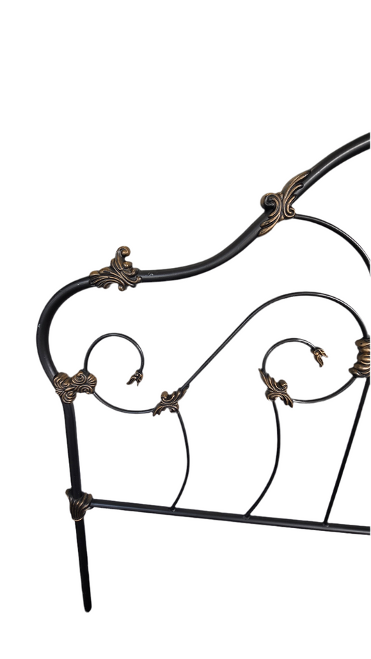 Elevate your bedroom with this beautifully crafted vintage queen-size bed frame featuring a black metal structure with ornate brass accents. The design blends classic elegance with a touch of antique charm. Includes both headboard and footboard. Sturdy, stylish, and perfect for vintage or romantic decor themes.