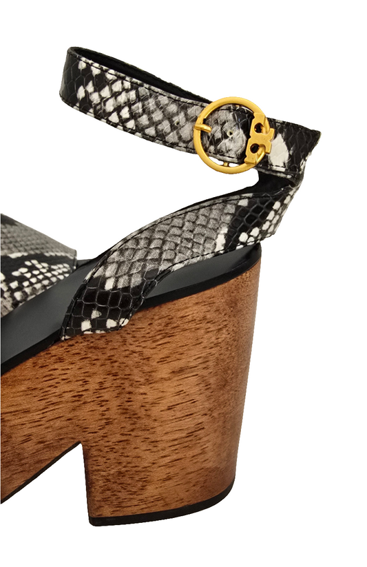Regular price $110.00Regular priceUnit price / perSale price $110.00A bold and stylish statement piece from Tory Burch, these black and white snakeskin platform sandals feature a chunky wood-textured sole and ankle strap with a gold buckle. The leather sole and high-end construction make them a standout addition to any wardrobe. Perfect for elevating your casual or summer look with a vintage-modern edge.